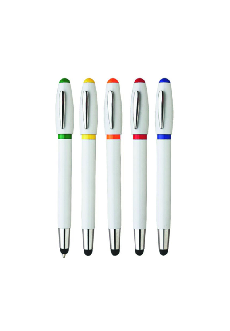 Touch pen a scatto in plastica con clip in metallo. Fusto bianco,