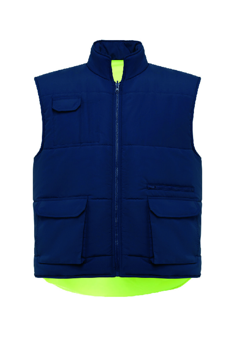Gilet reversibile multitasche alta visibilità con collo alto.