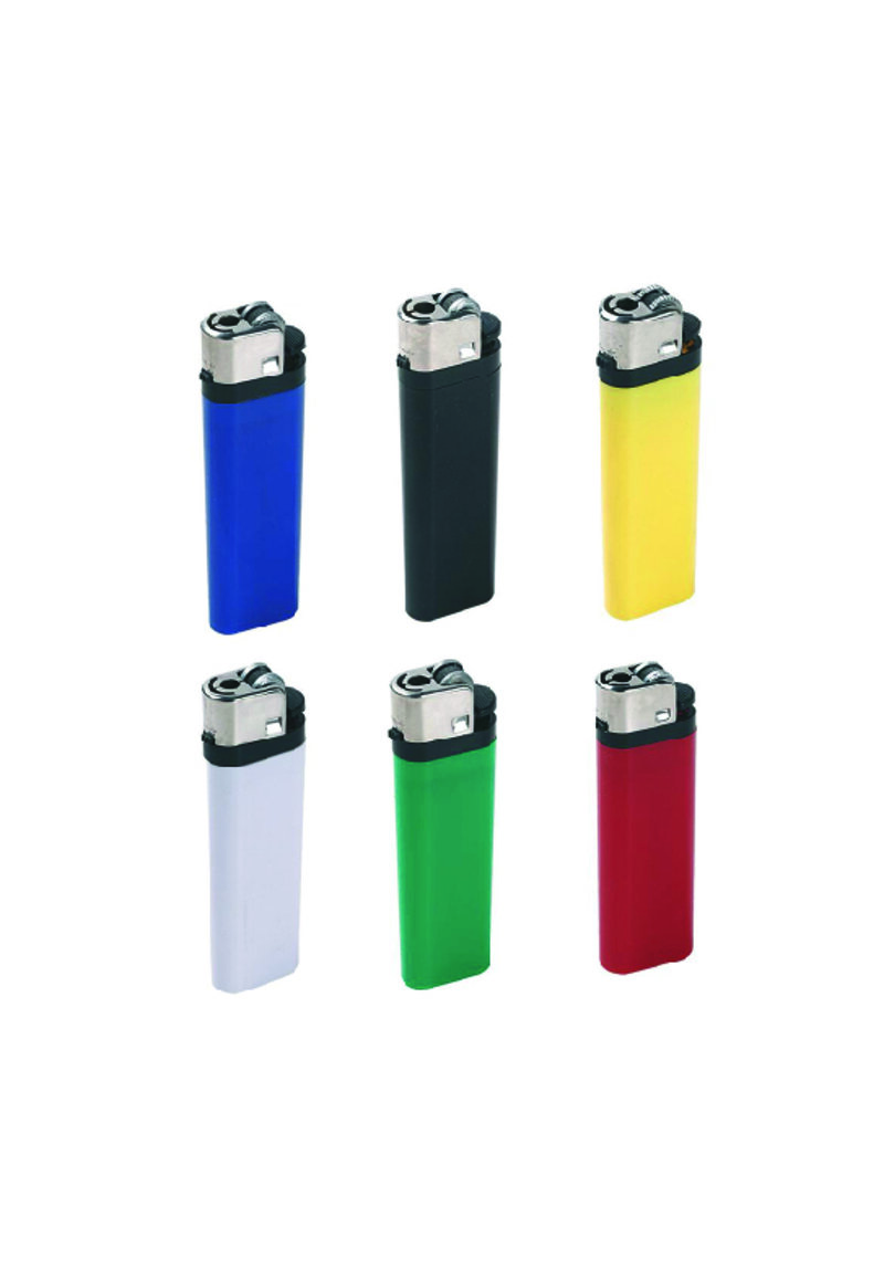 Accendino in plastica, pietra focaia, non ricaricabile. Colori: bianco, nero, giallo, blu, verde, rosso. Dimensioni cm 2,3x8
