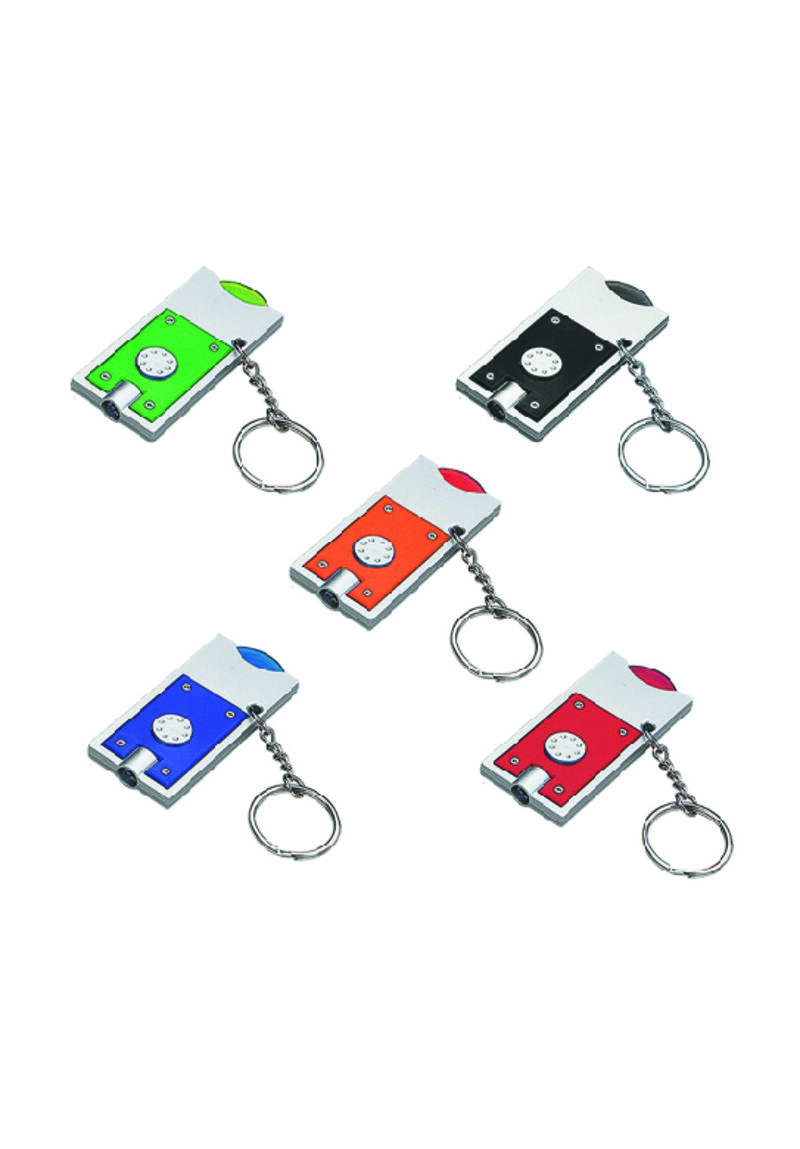 Portachiavi gettone con led in plastica. Colori: nero, blu, rosso, arancio, verde. Confezione in polybag. Dimensioni cm 7x3