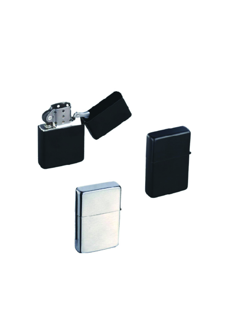 Accendino ricaricabile in metallo. Colori: nero, silver. Confezione in astuccio. Dimensioni cm.3,6x5,6x1,2.